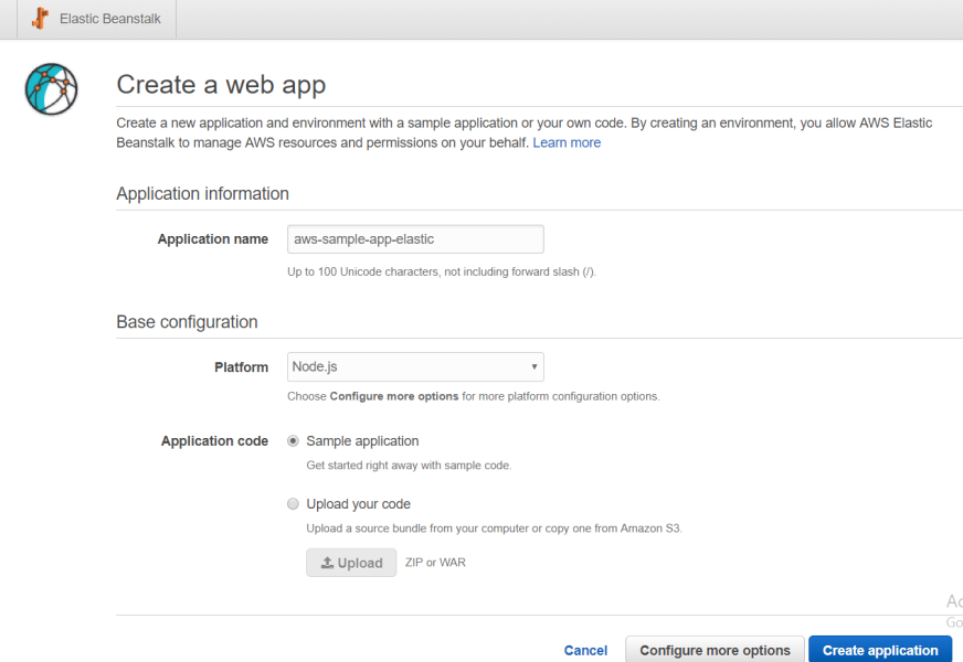 AWS CodePipeline could deploy code to Elastic Beanstalk or other AWS cloud platform, but at this blog, we'll set up to deploy to Elastic Beanstalk. For CodePipeline to deploy to Beanstalk, you'll have to create an application, since we are deploying a node.js app, we'll create an Elastic Beanstalk node.js app as following.